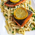 Portion pasta with a filet, skin side up. Gently press juice out of caramelized lemon slice over top and serve.